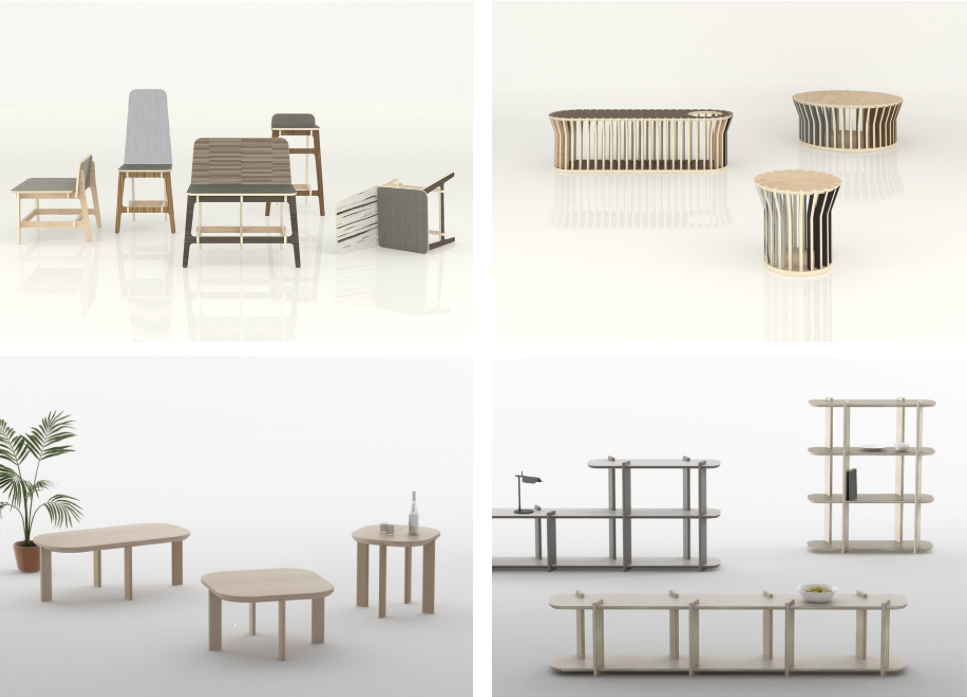 Actualmente, Me-Do permite a los usuarios trabajar sobre cuatro familias de producto que incluyen sillas, mesas y repisas hechas completamente en madera, para las que se puede escoger de forma simple detalles como el alto, largo y ancho, así como también sus texturas.