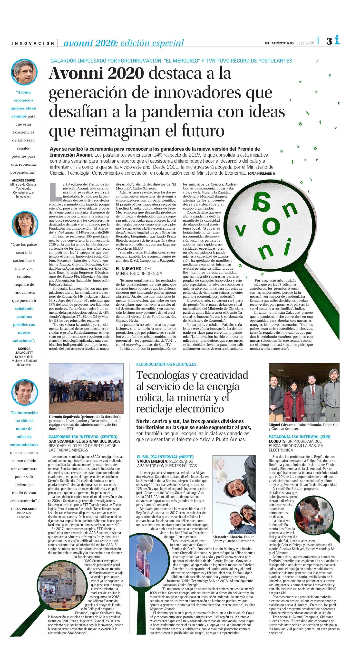 La 14ª edición del Premio de Innovación Avonni, cuya ceremonia final se realizó ayer, será inolvidable. No solo por la pandemia del covid-19 y sus efectos en Chile y el mundo, sino también porque este año, pese a las adversidades propias de la emergencia sanitaria, el número de proyectos que postularon a la iniciativa, que busca reconocer a los creadores más destacados del país y es impulsado por la Fundación ForoInnovación, ‘El Mercurio’ y TVN, aumentó 14% respecto de 2019.