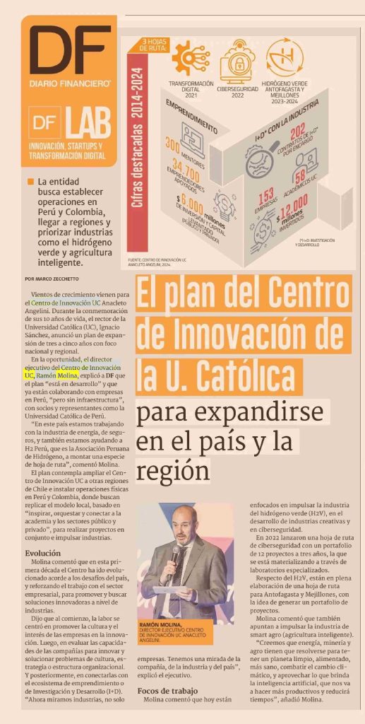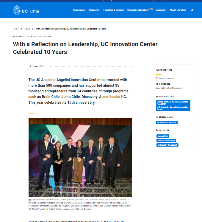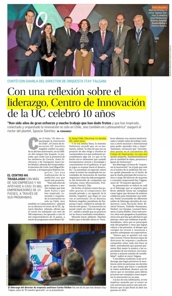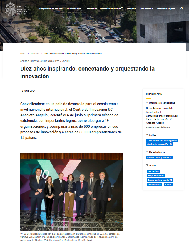 El pasado 6 de junio, el Centro de Innovación UC Anacleto Angelini cumplió 10 años inspirando, conectando y orquestando la innovación. Diversos medios de comunicación, que promueven con fuerza el ecosistema de emprendimiento e innovación, relevaron el masivo encuentro, proyectando, además, los retos que el Centro de Innovación UC, afronta para los años venideros.