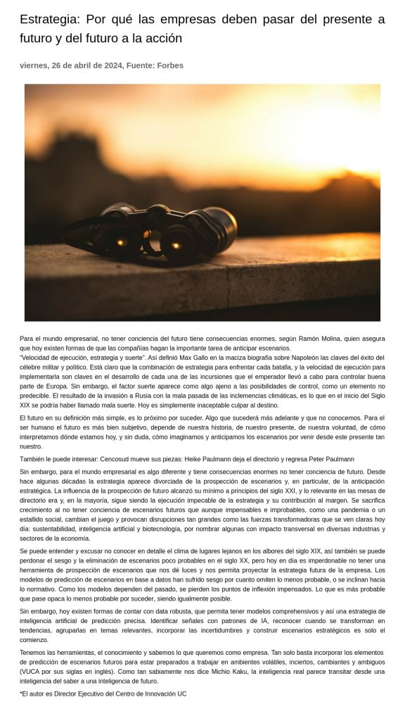 Sin embargo, para el mundo empresarial es algo diferente y tiene consecuencias enormes no tener conciencia de futuro. Desde hace algunas décadas la estrategia aparece divorciada de la prospección de escenarios y, en particular, de la anticipación estratégica. La influencia de la prospección de futuro alcanzó su mínimo a principios del siglo XXI, y lo relevante en las mesas de directorio era y, en la mayoría, sigue siendo la ejecución impecable de la estrategia y su contribución al margen. Se sacrifica crecimiento al no tener conciencia de escenarios futuros que aunque impensables e improbables, como una pandemia o un estallido social, cambian el juego y provocan disrupciones tan grandes como las fuerzas transformadoras que se ven claras hoy día: sustentabilidad, inteligencia artificial y biotecnología, por nombrar algunas con impacto transversal en diversas industrias y sectores de la economía.