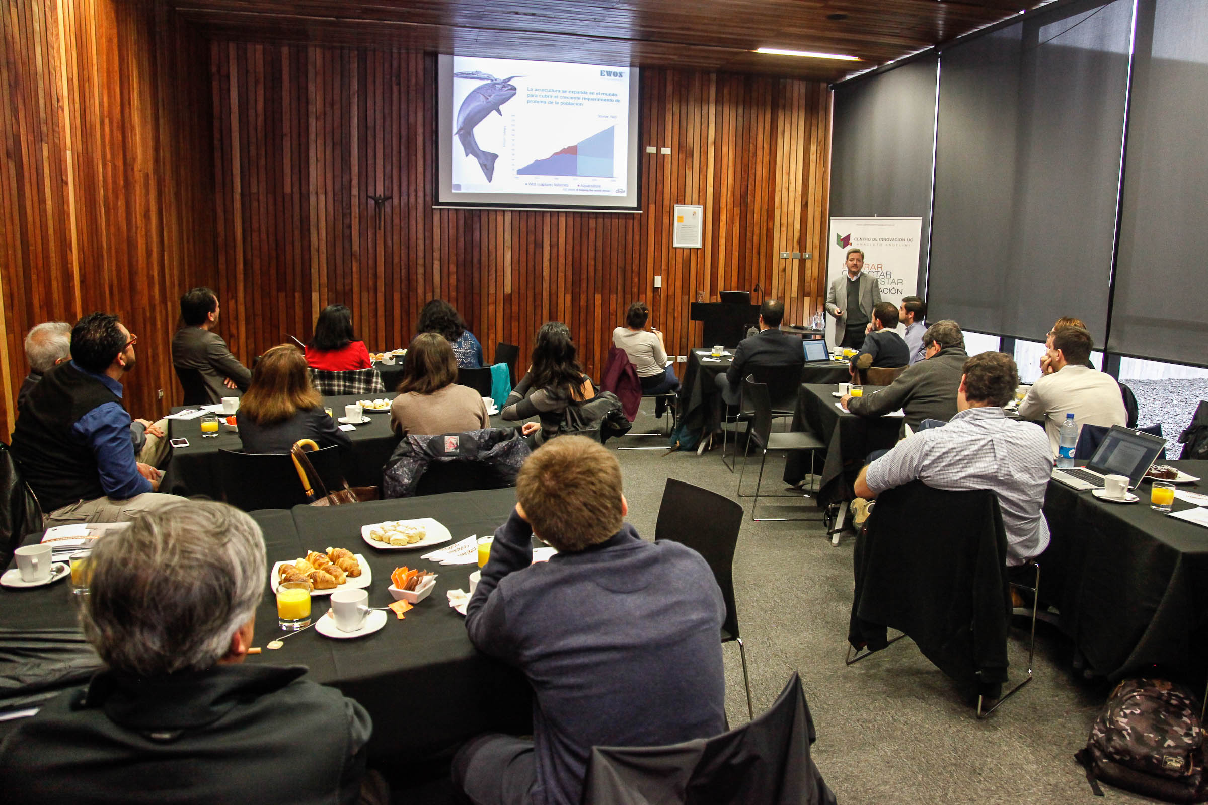 En este marco, se realizó en el Centro de Innovación UC el encuentro “Caso EWOS, desafíos del I+D de la Salmonicultura: la experiencia de EWOS-Cargill”, con la presencia de un público mixto de académicos y ejecutivos de empresas sus líneas y avances de I+D+i con el fin de sumar nuevos actores y trabajar colaborativamente en un esquema de innovación abierta.