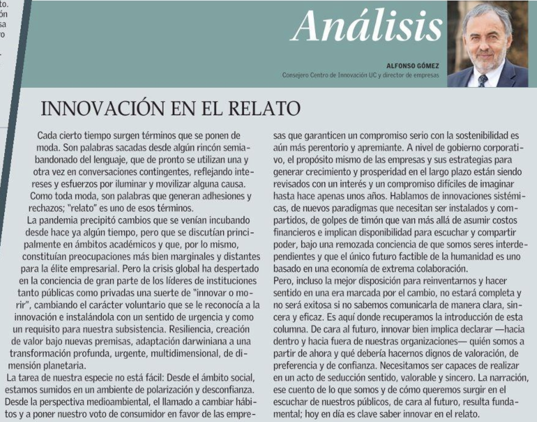 Columna de Alfonso Gómez, Consejero Centro de Innovación UC y Director de Empresas, publicada el 13 de octubre en El Mercurio.