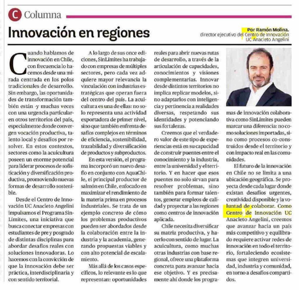 Chile necesita diversificar su matriz productiva, y hacerlo con sentido de lugar. La acuicultura, como muchas otras industrias con base regional, ofrece una plataforma concreta para avanzar hacia ese objetivo. Y es precisamente ahí donde los programas de innovación colaborativa como SinLímites pueden marcar una diferencia: no como soluciones importadas, sino como procesos co-construidos desde el territorio y con impacto real en las comunidades. El futuro de la innovación en Chile no se limita a una ubicación geográfica. Se proyecta desde cada lugar donde existan desafíos urgentes, creatividad disponible y la voluntad de colaborar. Como Centro de Innovación UC Anacleto Angelini, creemos que avanzar hacia un país más competitivo y equilibrado requiere activar redes de innovación en todo el territorio, fortaleciendo ecosistemas que integren universidad, industria y comunidad, en torno a desafíos compartidos.