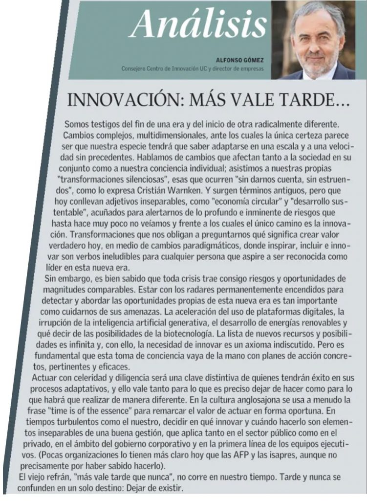 Columna de Alfonso Gómez, Consejero del Centro de Innovación UC y Director de Empresas, publicada el 11 de abril en El Mercurio.