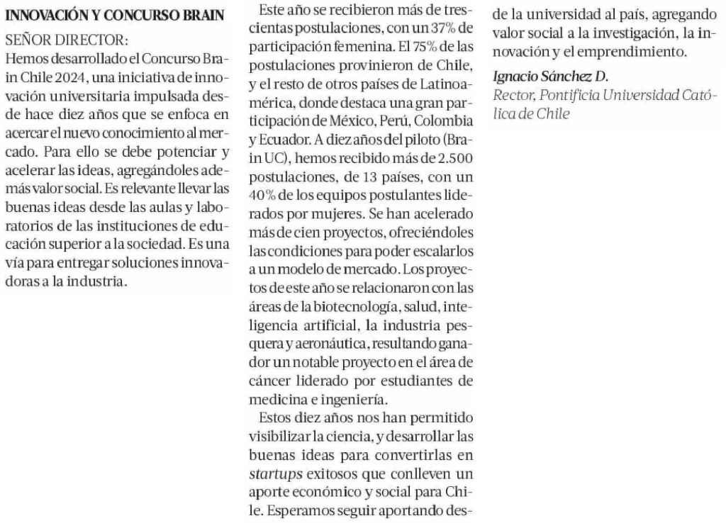 Hemos desarrollado el Concurso Brain Chile 2024, una iniciativa de innovación universitaria impulsada desde hace diez años que se enfoca en acercar el nuevo conocimiento al mercado. Para ello se debe potenciar y acelerar las ideas, agregándoles además valor social. Es relevante llevar las buenas ideas desde las aulas y laboratorios de las instituciones de educación superior a la sociedad. Es una vía para entregar soluciones innovadoras a la industria.