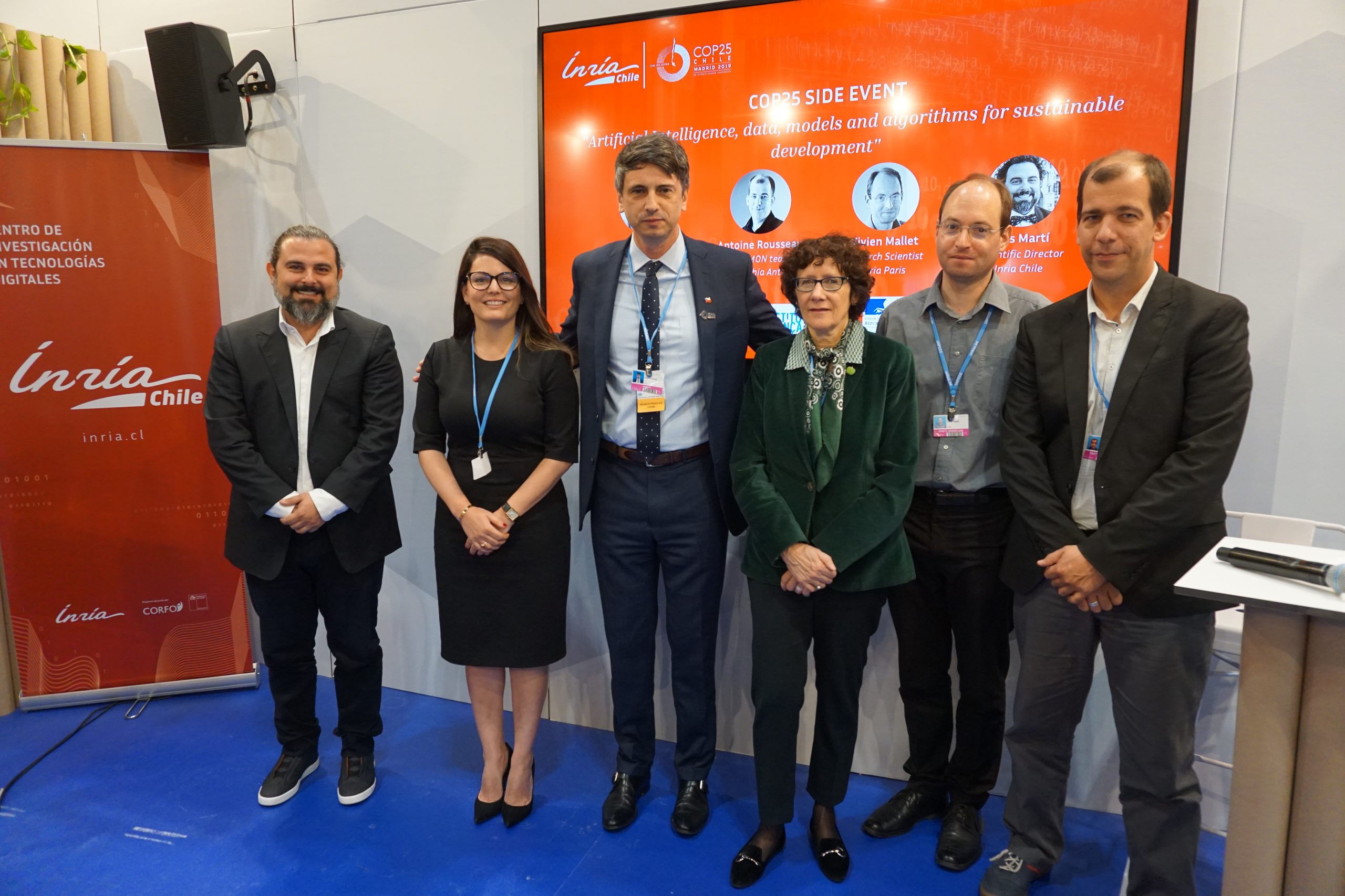 Cómo pueden contribuir las ciencias de la computación al desarrollo sostenible fue el tema de conversación en el side event que Inria Chile organizó hoy en el pabellón de Francia, en la zona azul de COP25. El encuentro reunió a la doctora en inteligencia artificial y directora del Centro de Investigación Inria Chile, Nayat Sánchez-Pi; al matemático Antoine Rousseau, quien ha desarrollado herramientas y algoritmos para acoplar varios modelos físicos, tanto para energías marinas como para la evaluación de riesgos en zonas costeras; a Vivien Mallet, científico que combina observaciones con simulaciones numéricas para modelar sistemas ambientales complejos que tienen aplicación en contaminación atmosférica, propagación del ruido urbano, tráfico vial, incendios forestales, energías renovables y predicción meteorológica; y al doctor en inteligencia artificial y director científico en Inria Chile, Luis Martí.