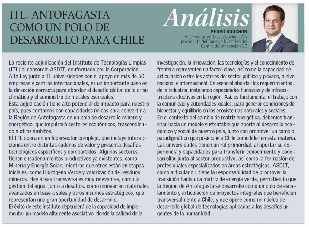 La reciente adjudicación del Instituto de Tecnologías Limpias (ITL) al consorcio ASDIT, conformado por la Corporación Alta Ley junto a 11 universidades con el apoyo de más de 50 empresas y Centros Internacionales, es un importante paso en la dirección correcta para abordar el desafío global de la crisis climática y el suministro de metales esenciales.