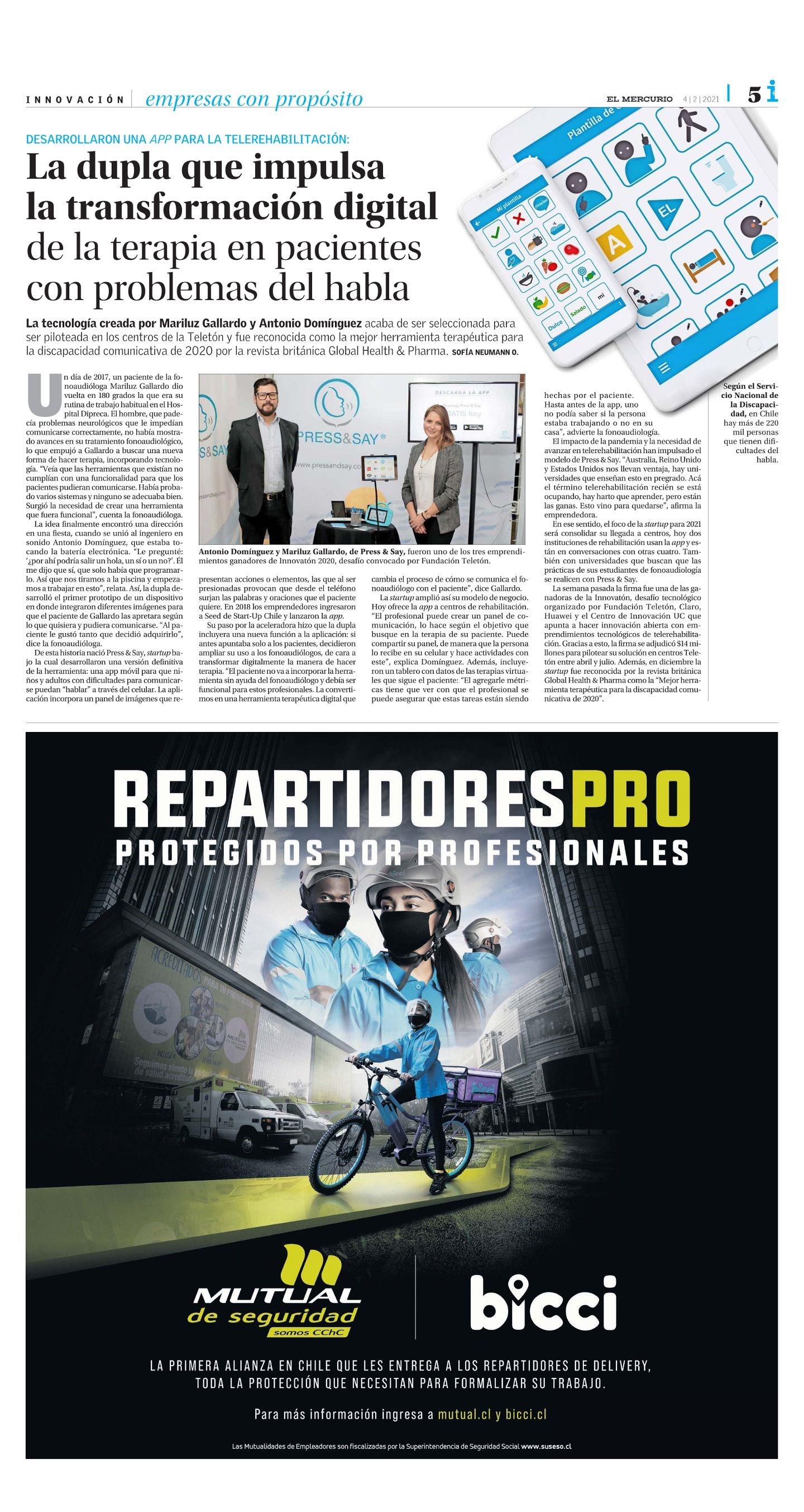 También con universidades que buscan que las prácticas de sus estudiantes de fonoaudiología se realicen con Press Say La semana pasada la firma fue una de las ganadoras de la Innovatón, desafío tecnológico organizado por Fundación Teletón, Claro, Huawei y el Centro de Innovación UC que apunta a hacer innovación abierta con emprendimientos tecnológicos de telerehabilitación. Gracias a esto, la firma se adjudicó SI4 millones para pilotear su solución en centros Teletón entre abril y julio. Además, en diciembre la startup fue reconocida por la revista británica Global Health Pharma como la “Mejor herramienta terapéutica para la discapacidad comunicativa de 2020”.