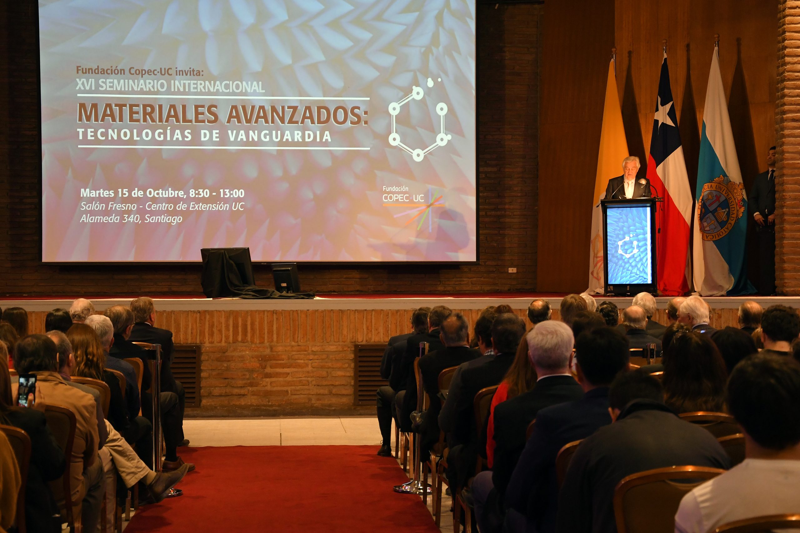 Posteriormente, Ignacio Sánchez, Vicepresidente de la Fundación COPEC-UC y Rector de la Pontificia Universidad Católica de Chile, destacó la importancia del tema del Seminario: “El desarrollo de materiales avanzados no solo es clave para la innovación, en un amplio espectro de tecnologías, sino que también incide en cómo enfrentamos los grandes desafíos que nos presenta la sociedad en áreas como: el cuidado del medio ambiente, la generación limpia de energías, la medicina del futuro, sólo por nombrar algunas áreas. Los materiales avanzados son parte de una nueva revolución tecnológica global, dado su potencial innovador y transformador, especialmente en una economía e industria que se basa en ellos”.