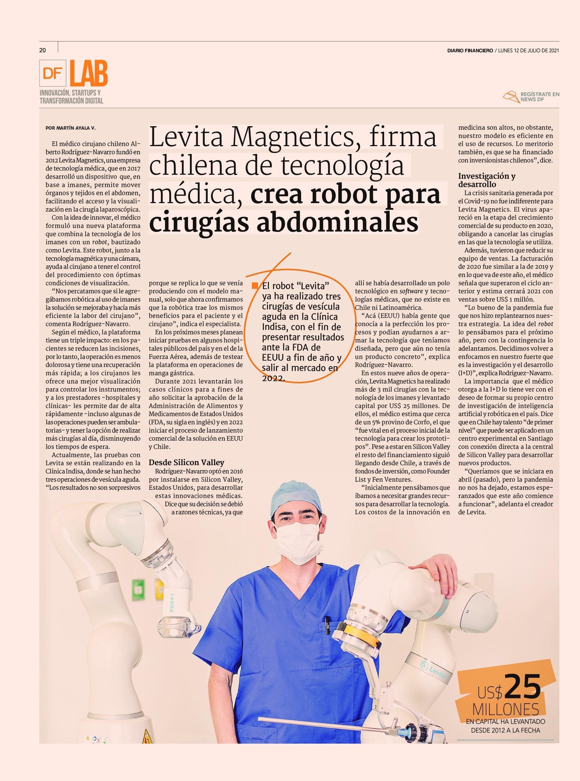 El médico cirujano chileno Alberto Rodríguez-Navarro fundó en 2012 Levita Magnetics, unaempresa de tecnología médica, que en 2017 desarrolló un dispositivo que, en base a imanes, permite mover órganos y tejidos en el abdomen, facilitando el acceso y la visualización en la cirugía laparoscópica. Con la idea el médico formuló una nueva plataforma que combina la tecnología de los imanes con un robot, bautizado como Levita. Este robot, junto a la tecnología magnética y una cámara, ayuda al cirujano atener el control del procedimiento con óptimas condiciones de visualización. “Nos percatamos que si le agregábamos robótica al uso de imanes la solución se mejoraba y hacía más eficiente la labor del cirujano”, comenta Rodríguez-Navarro.