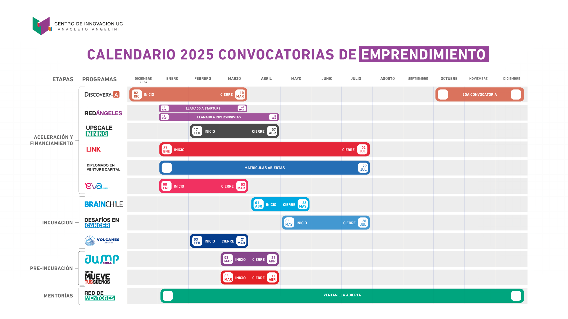 Organizados por etapas de crecimiento, las fechas de los programas de emprendimiento son: