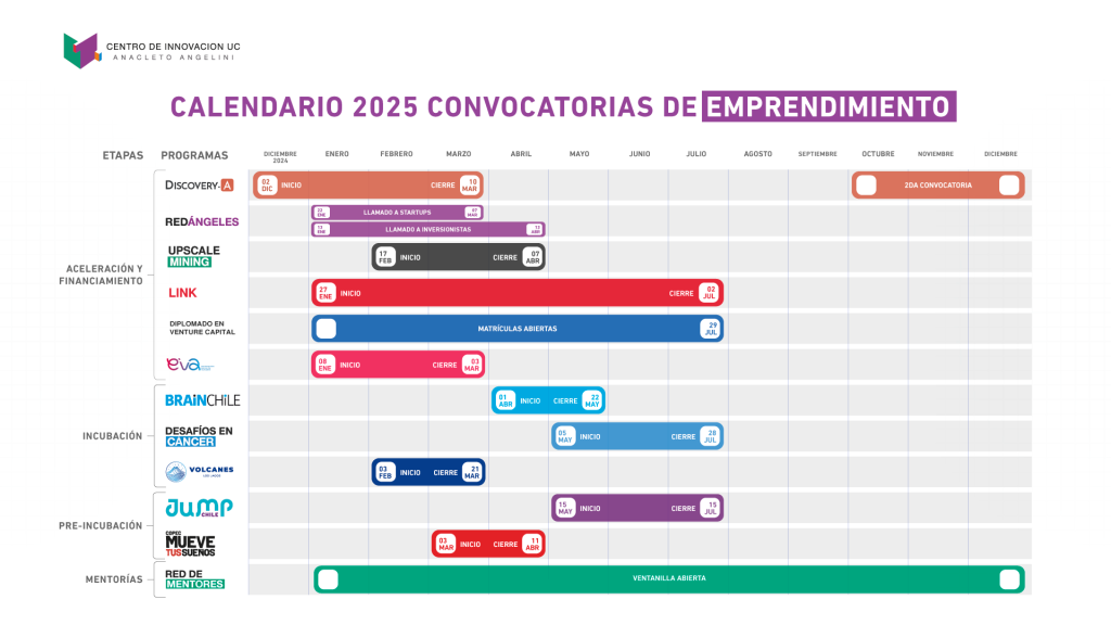 Impulsar el crecimiento, posicionamiento y escalamiento de las diversas startup en Chile y Latinoamérica sigue siendo uno de los objetivos del Centro de Innovación UC Anacleto Angelini, por lo que este 2025 el calendario se viene cargado de alternativas para que participes con tu emprendimiento.