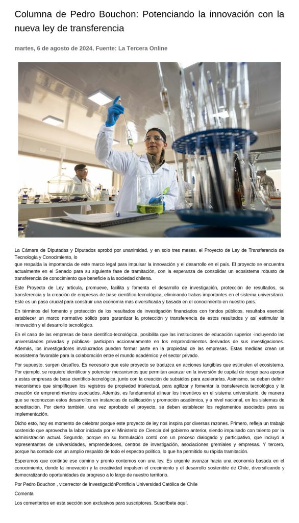 que respalda la importancia de este marco legal para impulsar la innovación y el desarrollo en el país. El proyecto se encuentra actualmente en el Senado para su siguiente fase de tramitación, con la esperanza de consolidar un ecosistema robusto de transferencia de conocimiento que beneficie a la sociedad chilena.