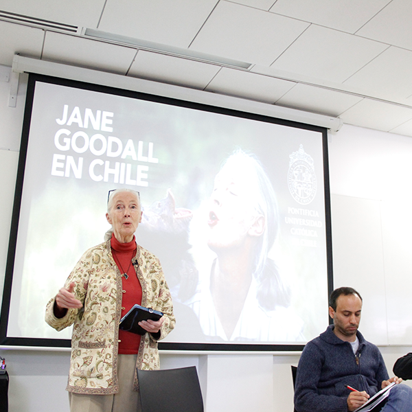 Jane Goodall visitó el país para apoyar el trabajo de Roots&Shoots Chile, el programa educativo del Instituto Jane Goodall, que funciona en el país desde 2013, pero que ahora será potenciado con la instalación formal de este centro en Chile. Durante su estadía, la investigadora también se reunió con el Ministro del Medio Ambiente, Pablo Badenier, que se comprometió con ella a instaurar el “Día de la fauna chilena”, y dictó una conferencia abierta en el Salón Fresno del Centro de Extensión, donde habló directamente a cientos de niños y jóvenes sobre la importancia de cuidar los ecosistemas.