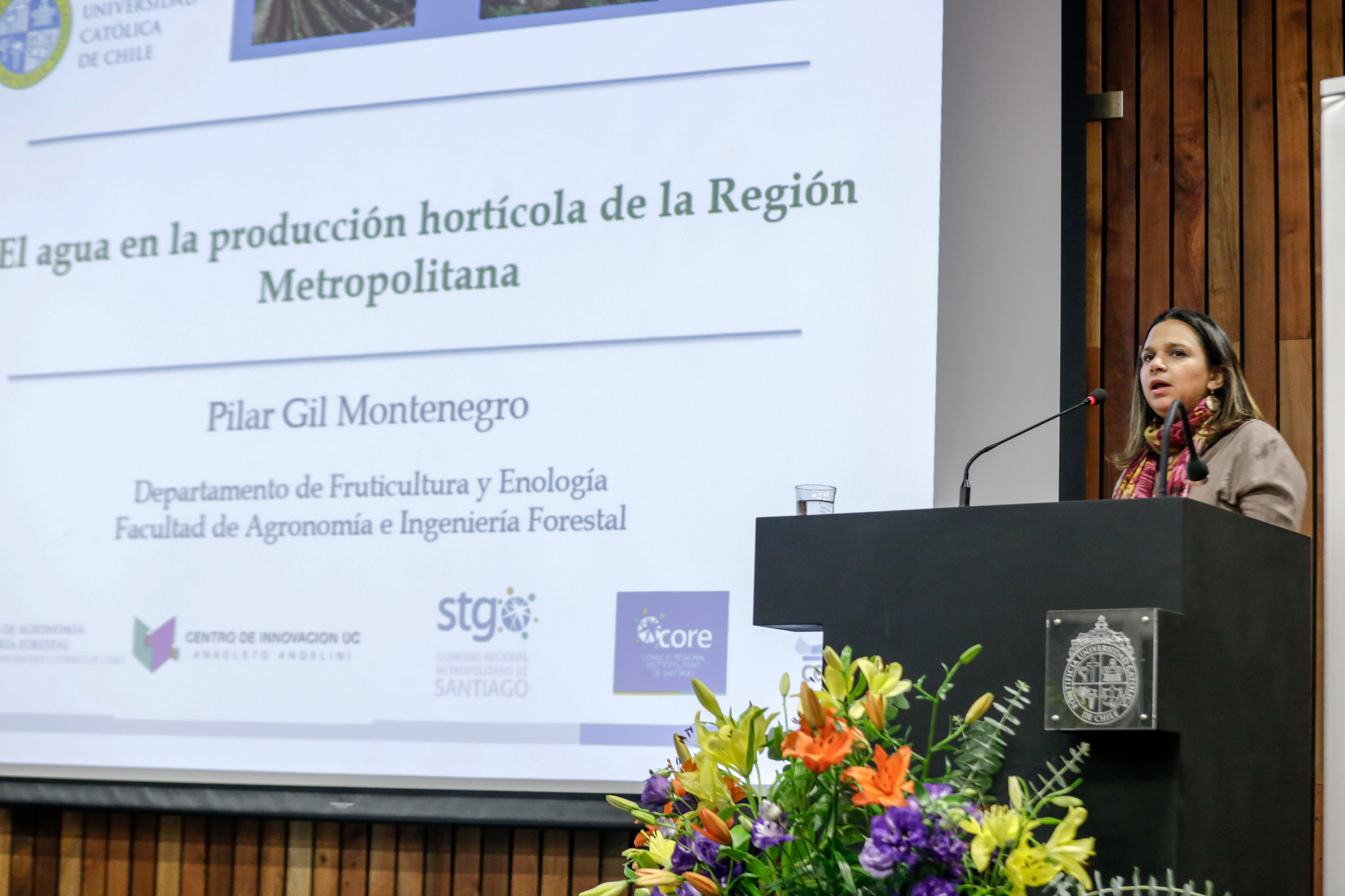 Para hacer frente a esta situación, Pilar Gil, investigadora de la Facultad de Agronomía e Ingeniería UC, lidera un proyecto de investigación y desarrollo para mejorar la eficiencia de uso e inocuidad del recurso hídrico en la Región Metropolitana. Este proyecto, ejecutado en colaboración con el Gobierno Regional de Santiago, testea e implementa nuevas tecnologías de riego por aspersión junto a pequeños y medianos agricultores de la Región.