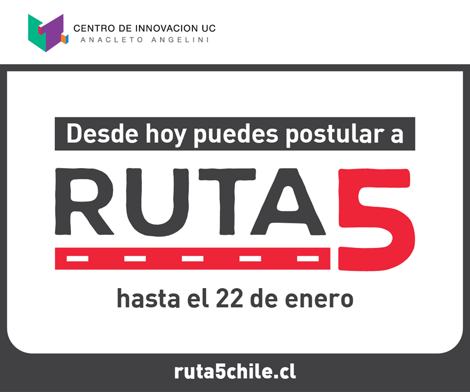 La convocatoria Ruta 5 busca inspirar la innovación de alto impacto económico, social y medioambiental, congregando a empresas, academia e instituciones de apoyo al ecosistema con el fin de generar un ambiente inclusivo junto una comunidad de más de 15 mil startups, que han postulado a los diferentes programas de emprendimientos del Centro de Innovación UC.
